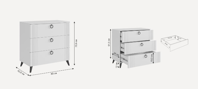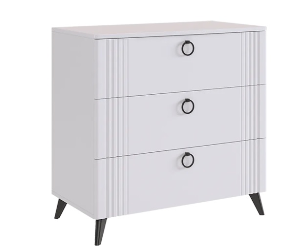 Изысканный и практичный комод Ева состоит из трёх больших ящиков, в которых можно разместить все необходимые вещи, а на широкой столешницы можно поставить цветы, фотографии близких людей, картину или элементы декора. Комод Наоми прекрасно впишется в интерьер вашей комнаты, а также привнесет нотки элегантности.Образ тумбы дополняется интересной и стильной металлической фурнитурой.