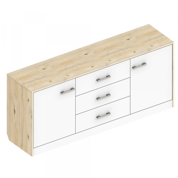 Комод имеет две распашные дверцы, за которыми находится пространство для хранения. Кроме того, он оснащен тремя выдвижными ящиками, которые увеличивают объем хранения. Ящики оснащены качественными направляющими, что обеспечивает плавное и безупречное открытие и закрытие.