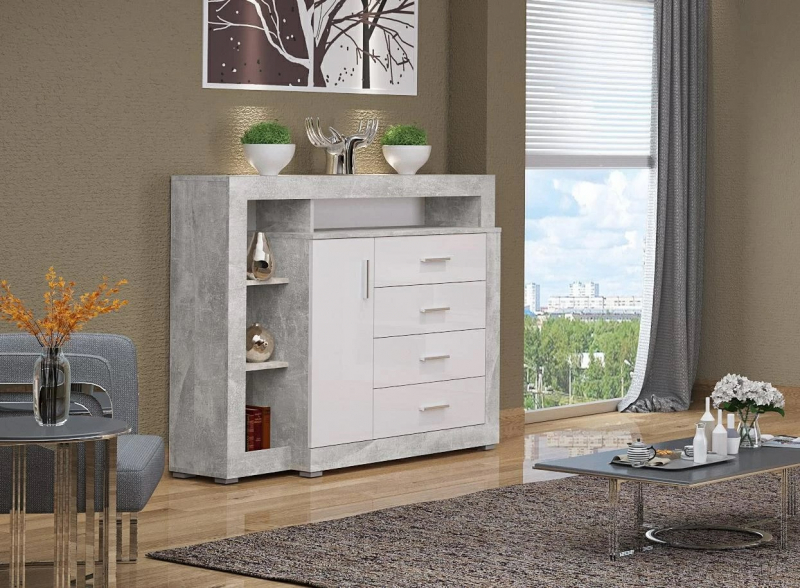 Комод обрамляет углубленная секция с полками. Её края оформлены наличником. Необычная текстура корпуса — под серый камень — добавит нотки стиля лофт в интерьер.