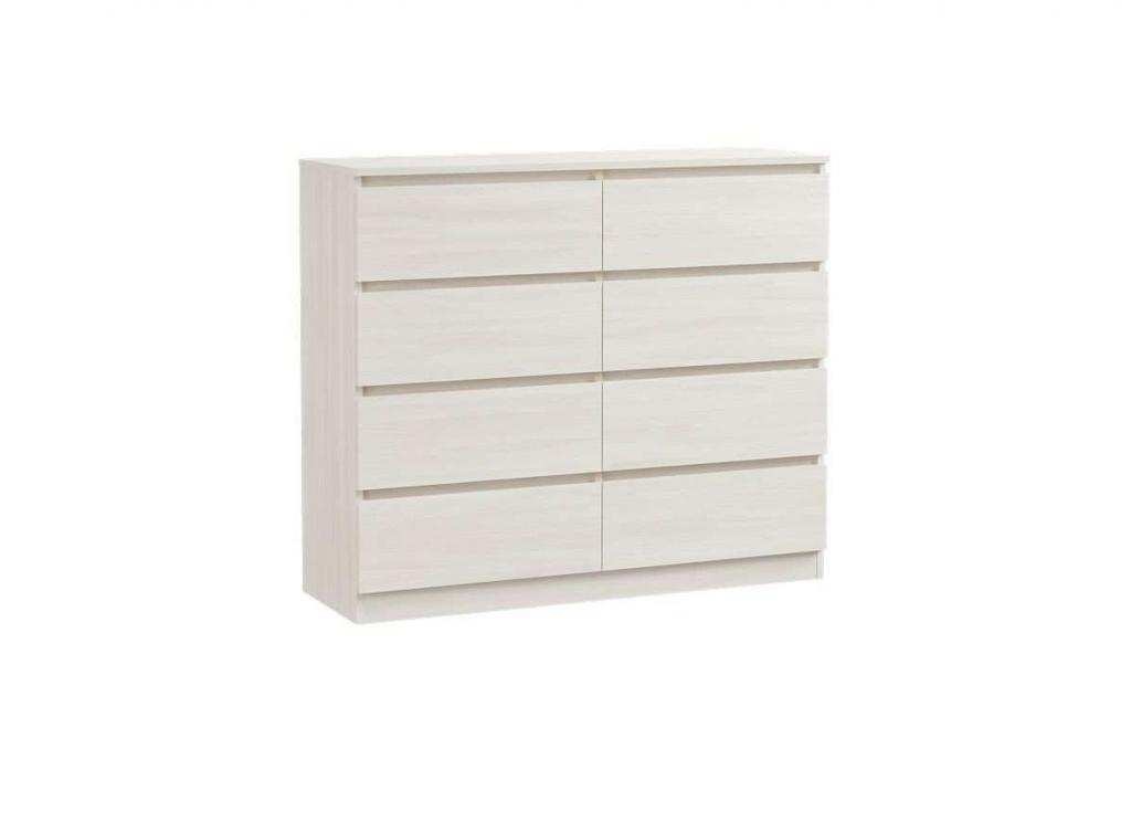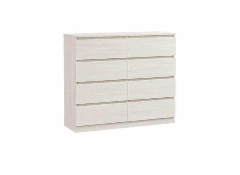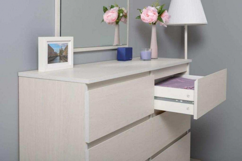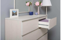 На комоде отсутствует лицевая фурнитура, что подчёркивает чистоту форм и линий. Для удобства открывания, с внутренней стороны фасадов сделан срез.