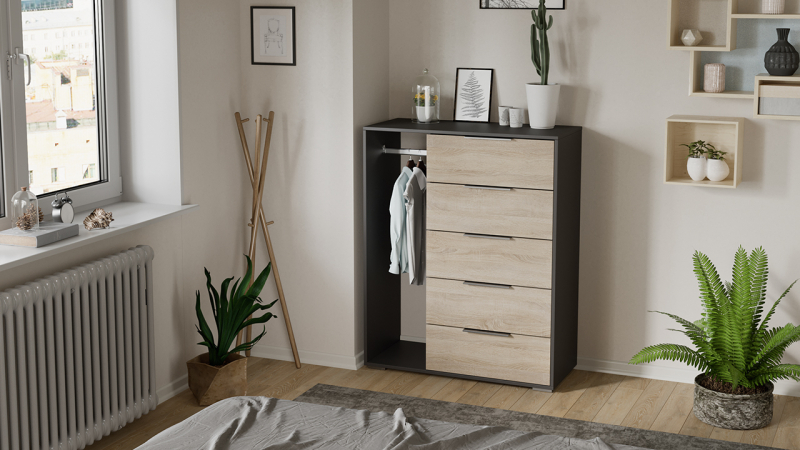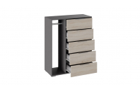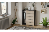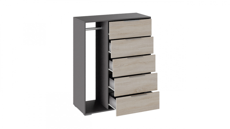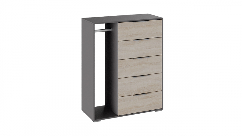 Оригинальный комбинированный комод «Нуар» состоит из двух секций: в левой находится вешалка для одежды, в правой – пять выдвижных ящиков для горизонтального хранения вещей. Подобная конструкция мебели позволит сэкономить место в доме, а потому прекрасно подойдет для малогабаритных помещений, квартир-студий или детских комнат. Светлый деревянный фасад комода гармонично сочетается с каркасом в сером оттенке.
