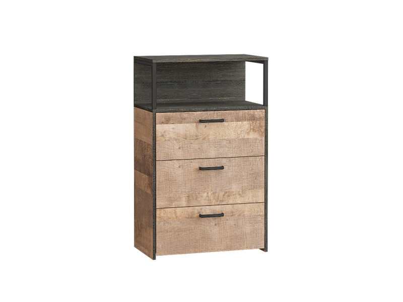 Комод с ящиками Трувор 13.307.02 будет отличным дополнением интерьера любой комнаты. На открытой полке будут гармонично смотреться интересные и увлекательные книги, семейные фотографии, коллекции интересных предметов, оригинальные сувениры, статуэтки и детские поделки. В трех выдвижных ящиках можно хранить более ценных и важные предметы, а также одежду и белье. Индустриальная мебель Трувор выполнена в стиле лофт.
