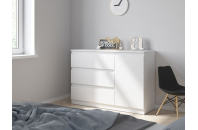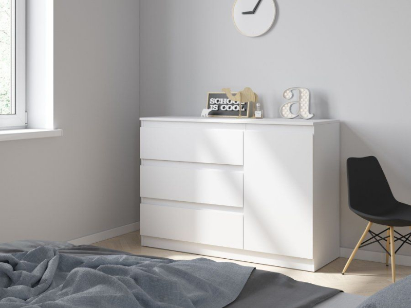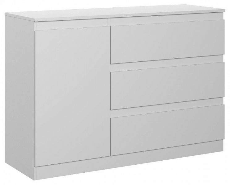Комод Т-7 Штерн с дизайном без лишних деталей прекрасно вписывается в интерьер любой комнаты, за счет белоснежной цветовой гаммы не перегружает пространство помещения, делает его светлым, легким и уютным. Модель с одной стороны оснащена тремя вместительными ящиками, а с другой, за распашной дверью скрывается отделение для размещения необходимых в быту вещей и предметов, в котором имеется удобная полка. На верхнюю поверхность комода можно поставить телевизор, часы, статуэтки, элементы декора или дополнить его зеркалом.