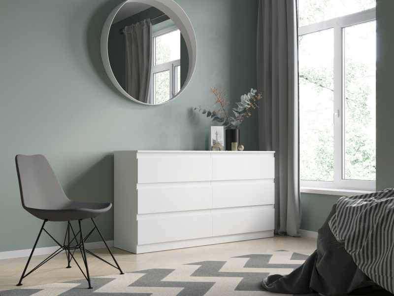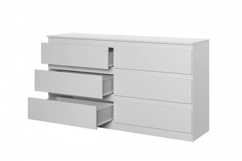 Комод коллекции STERN Т-06 в стиле минимализма с 6 выдвижными ящиками. Корпус и фасады выполнены из ЛДСП. Для выдвижения ящиков использованы роликовые направляющие. Комод разделен на две секции перегородками, в каждой секции 3 выдвижных ящика. Это позволяет более детально рассортировать вещи. На фасадах ящиков отсутствуют ручки. Ручками являются сами фасады, между которыми предусмотрены специальные отступы для удобства открывания. Этот комод не теряет своей актуальности и является классикой. Впишется в любой интерьер, добавит стиля и уюта. Подходит для любых комнат: для гостиной, спальни, детской комнаты, прихожей. Служит для хранения вещей: одежды, нижнего белья, детских игрушек, обуви, документов.