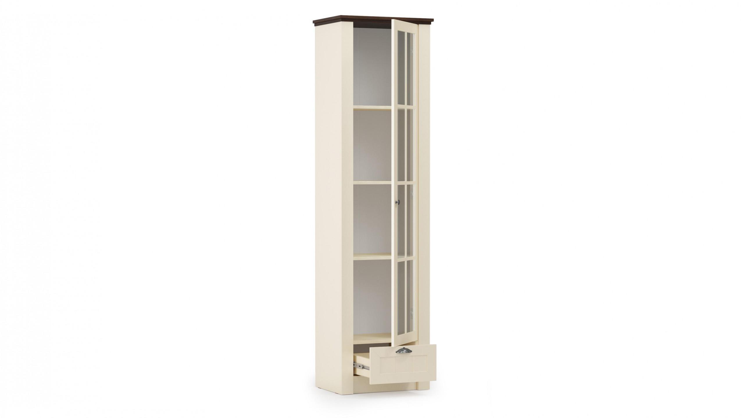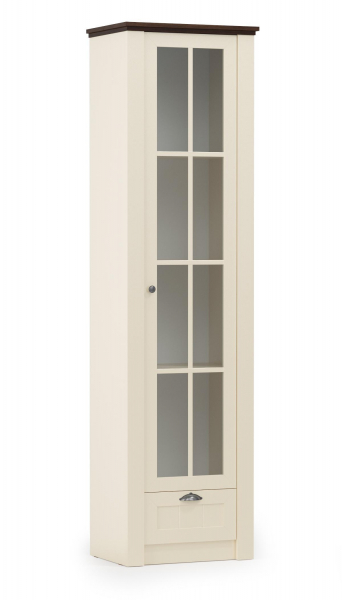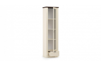 Стильный комбинированный одностворчатый шкаф или витрина представлен с верхним отделением с тремя полками из ЛДСП за распашной дверцей с расстекловкой и с выдвижным ящичком в основании. Витрина выполнена из ЛДСП в бежевой тонировке с фасадами из прозрачного стекла в обрамлении МДФ-профиля в тонировке слоновая кость и с крышкой в тонировке дуб кальяри. Выдвижной ящик оснащен шариковыми направляющими полного выдвижения.