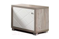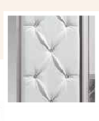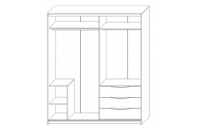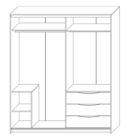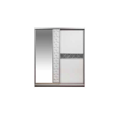 На шкаф-купе установлена система раздвижения Сенатор,которая обеспечивает плавное и бесшумное скольжение дверей и создаёт эффект парения в воздухе. Левая дверь изготовлена из зеркальной вставки и вставки из Эко кожи с использованием технологии «Каретная стяжка», устойчивость к истиранию 150 000 циклов. Правая дверь изготовлена со вставками из зеркала с гравировкой в форме ромбов и стекла лакобель белого цвета. Лакобель представляет собой специальным образом окрашенное стекло. Детали шкафа, крышка, боковые стенки, которые в эксплуатации подвержены механическим повреждениям, облицованы кромкой ПВХ. В правой и левой части шкафа за дверями штанга для одежды, также в правой части шкафа за дверями установлены ящики.