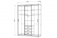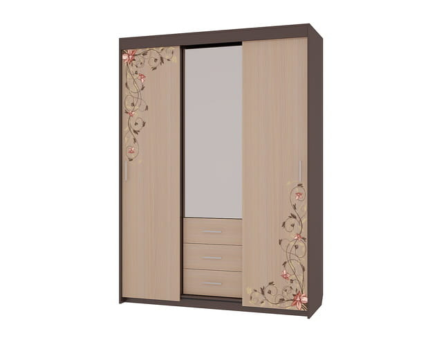 Шкаф для одежды с зеркалом из серии «Виктория 2.06» в сочетании дуб млечный и венге. Двери-купе с декоративным рисунком и центральная распашная дверь с зеркалом. В шкафу есть 2-е штанги для Вашей одежды, полки для вещей и 3 выдвижные ящика на роликовых направляющих. На зеркальной двери предусмотрена специальная наклейка против пятен в месте для открывания.