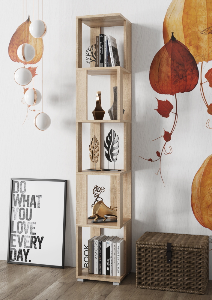 Стеллаж Штерн станет эффектным дополнением системы хранения в любом интерьере. Оригинальная конструкция шкафа столбика не занимает много места, при этом позволяет красиво расставить книги, декор, комнатные цветы или детские игрушки. Открытые полки не загромождают пространство, поэтому модель отлично смотрится как в просторной, так и в небольшой по площади комнате.