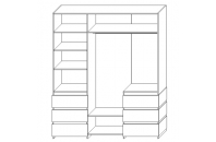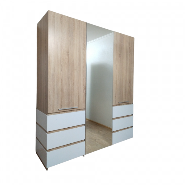 Функциональный и удобный в эксплуатации шкаф для одежды 3Д Хилтон благодаря своему стильному и оригинальному дизайну, может дополнить любой интерьер спальни или гостиной. К средней двери шкафа крепится зеркало с фацетом 10мм по двум сторонам. Шкаф оснащен шестью ящиками на шариковых направляющих H=35 AKS LIGHT, обеспечивающим удобный доступ к их внутреннему пространству. Функцию ручки на накладках ящиков выполняет фрезеровка выемка в торце фасада. В левой части шкафа за дверью установлены две съемные полки и одна несъемная. В средней и правой части шкафа - штанга для одежды. На боковых стенках закреплены декоративные накладки из МДФ пленочного толщиной 8мм в цвет фасада. Детали шкафа, которые в эксплуатации подвержены механическим повреждениям, облицованы кромкой ПВХ толщиной 2 мм.