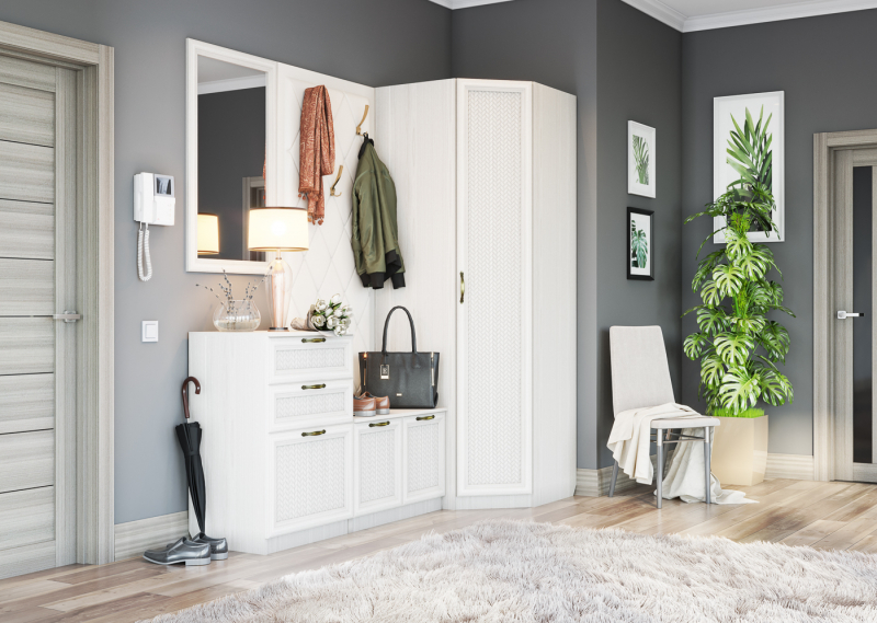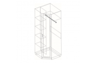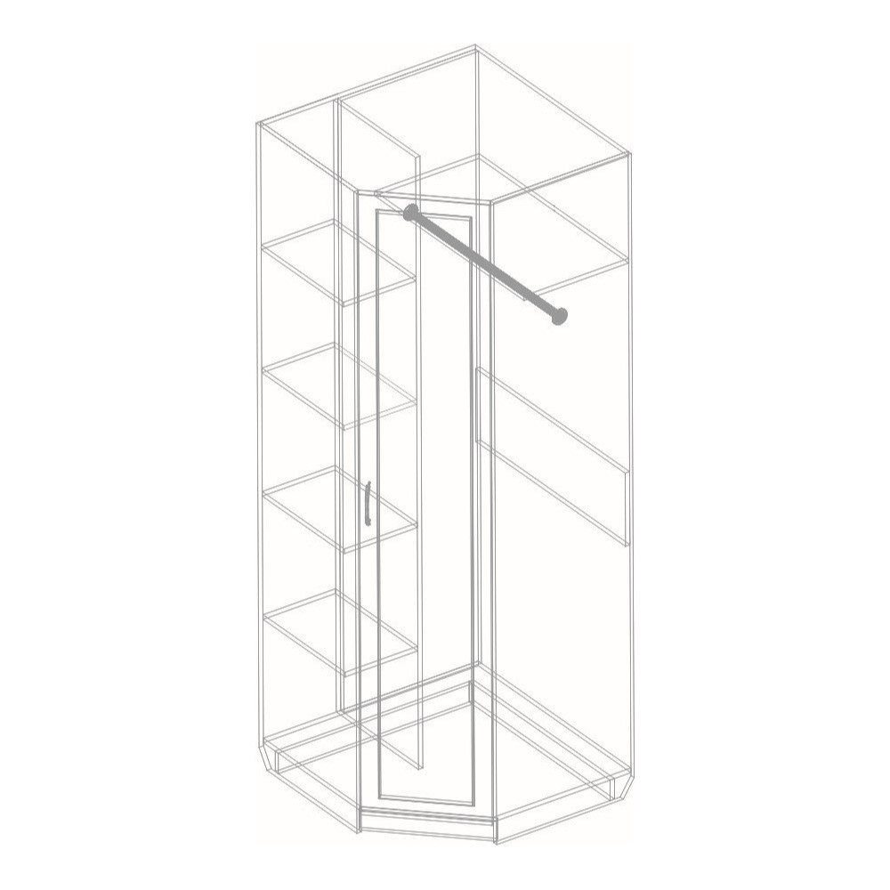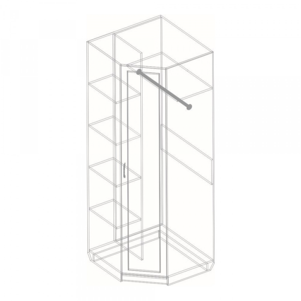Практичный угловой шкаф, позволяющий рационально использовать угловое пространство. Наполнение шкафа классическое - секция с четырьмя полками, антресольная полка и штанга для одежды.