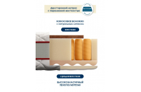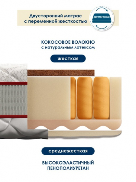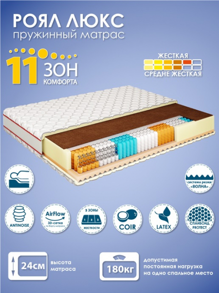 Высота 24 см. Допустимая постоянная нагрузка на одно спальное место 180 кг. Матрас двусторонний. Одна сторона жесткая, вторая - средне-жесткая.Основные достоинства модели