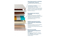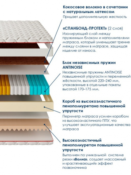 Независимые пружины ANTINOISE повышенной упругости, высотой 220–240 мм, упакованные в отдельные пакеты высотой 170–175 мм, закрытые нетканым материалом «СПАНБОНД-ПРОТЕКТ» с двух сторон. Такой улучшенный пружинный блок создаёт высокую точечную упругость и поддержку тела даже при очень высокой допустимой постоянной нагрузке, обеспечивает максимально естественное положение позвоночника во время отдыха и обладает повышенной комфортностью.