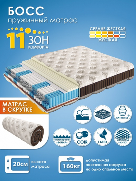 Высота 20см, допустимая постоянная нагрузка на одно спальное место 160 кг. Матрас двусторонний. Одна сторона средне жёсткая, вторая - жёсткая.Основные достоинства модели