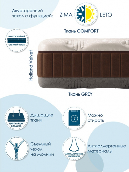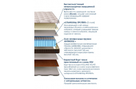 Независимые инновационные пружины ANTINOISE повышенной упругости, средней жёсткости, высотой 165 мм, упакованные в отдельные пакеты высотой 145 мм, закрытые нетканым материалом «СПАНБОНД-ПРОТЕКТ» с двух сторон. С одной стороны блока — кокосовое волокно с натуральным латексом 10 мм для дополнительной жёсткости. С другой — высокоэластичный пенополиуретан повышенной упругости высотой 25 мм, выполнен с волной по уникальной системе резки, создаёт массажный эффект.