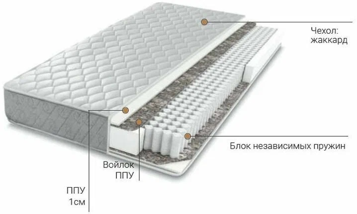 Мягкий матрас на основе независимого пружинного блока, который равномерно распределяет нагрузку по всей поверхности матраса и обеспечивает направленную поддержку позвоночника.