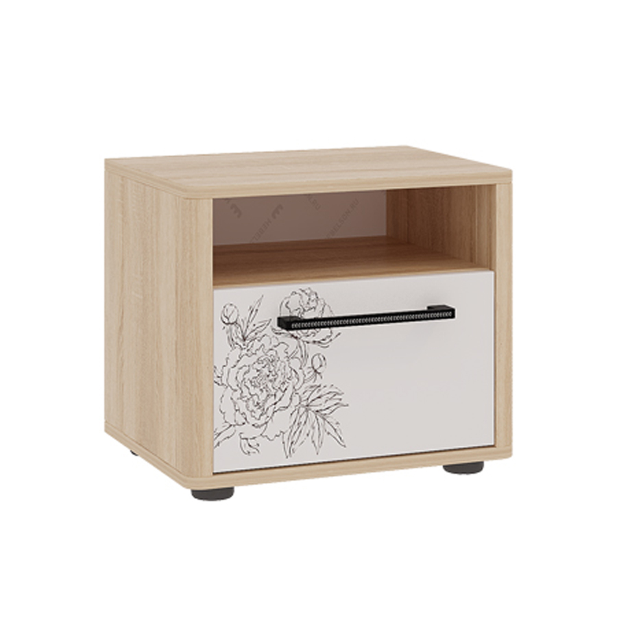 Прикроватная тумба «Зара» дополнит Ваш интерьер и прекрасно подойдет для хранения самых необходимых вещей как в открытой нише, так и в закрытом выдвижном ящике. Отличительной особенностью данной серии являются закругленные углы, которые обеспечат максимальную безопасность в использовании изделий. Принтерный рисунок на фасаде подчеркивает общий стиль коллекции.