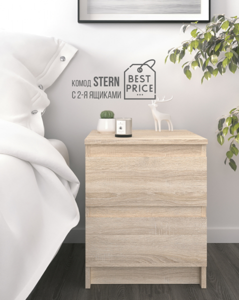 Комод STERN Т-1 можно использовать как прикроватную тубу,что позволит держать около кровати все необходимые и важные предметы. На поверхности изделия вы можете красиво разместить интересный светильник, будильник или фотографию любимой семьи. Два выдвижных ящика пригодятся для хранения увлекательной книги, маски для сна и ночного крема.