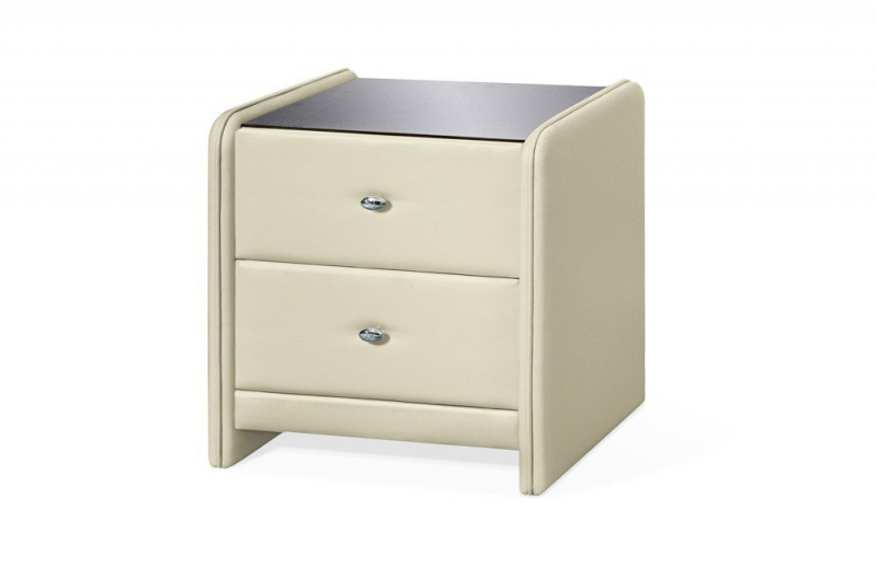 Модная тумба, которая поможет сделать зону сна гораздо более удобной. Прикроватная тумба выполнена из комбинированных материалов. Каркас изготавливается из ДСП высокой прочности. В качестве обивочного материала используется экокожа. Крышка представлена закаленным стеклом.Тумбочка из экокожи обладает отменными эксплуатационными характеристиками. Она не трескается, со временем не меняет цвет. Кожзаменитель обладает водоотталкивающим эффектом, при правильном уходе на протяжении долгих лет сохраняет свою привлекательность. Устойчивый к повреждениям, этот материал не требует особого ухода и легко моется. Тумбочка идеально подходит к серии мягких кроватей. Изделие безопасное, о ее мягкие края нельзя травмироваться.Прикроватная тумба предусматривает два глубоких выдвижных ящика. Внутри можно разместить еще больше необходимых вещей. Ящики легко открываются благодаря удобной хромированной ручке.
