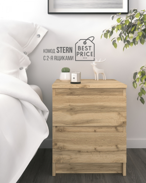 Комод STERN Т-1 можно использовать как прикроватную тубу,что позволит держать около кровати все необходимые и важные предметы. На поверхности изделия вы можете красиво разместить интересный светильник, будильник или фотографию любимой семьи. Два выдвижных ящика пригодятся для хранения увлекательной книги, маски для сна и ночного крема.
