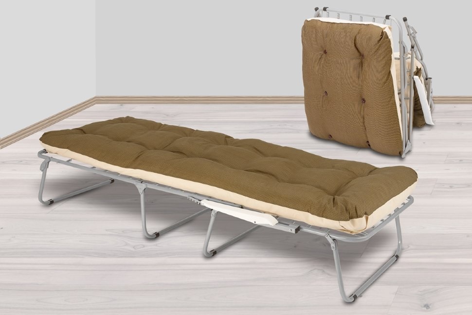 Раскладушка кресло - кровать Селла с подлокотниками. Несъемный матрас, который закреплен к каркасу на пружинах, обладает конструкцией, позволяющей получить полноценное спальное место для одного человека и удобное кресло для отдыха. Она имеет крепкий, устойчивый металлический каркас. Для него подобраны прочные стальные трубы, которые имеют диаметр в 20 мм. Толщина стенок каждой трубы равна 1 мм.