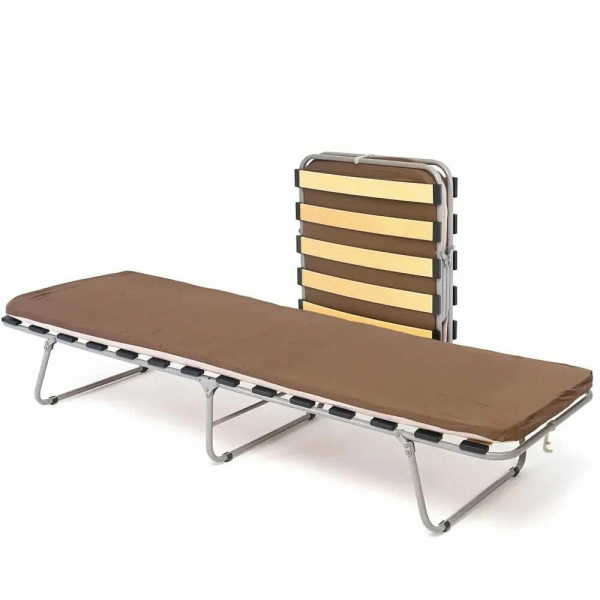 Каркас изготовлен из стальной трубы 20х1 мм. Основание изготовлено из ортопедических деревянных ламелей. Модель имеет нагрузку до 90кг. В сложенном положении с матрасом, практически не занимает места.