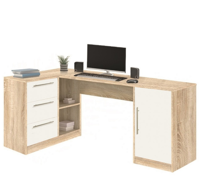 10.11 Стол компьютерный угловой. Сочетание классического дизайна, высокой функциональности и эргономичности. Стол имеет угловую рабочую поверхность с двумя встроенными тумбами. Одна тумба оборудована 3-мя выдвижными ящиками на роликовых направляющих и двумя открытыми нишами для хранения бумаг и канцтоваров. Вторая тумба с одним закрытым отделением с распашной дверкой. Фасады выдвижных ящиков и дверки укомплектованы ручками-рейлингами.