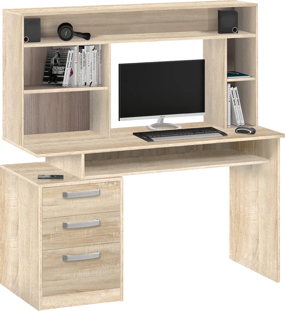 Вместительный и функциональный стол выполнен в современном стиле. Такой компьютерный стол займет достойное место в Вашем кабинете или детской. Стол оборудован выдвижными ящиками, открытей нишей под столешницей и надстройкой с полками. Стильный компьютерный стол станет Вашим любимым местом работы.