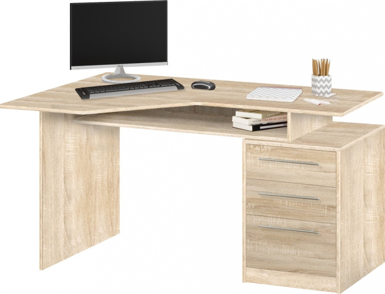 10.07 Стол компьютерный угловой. Сочетание классического дизайна, высокой функциональности и эргономичности.Стол оборудован угловой  столешницей и тумбой с 3-мя выдвижными ящиками на роликовых направляющих. Под столешницей имеется открытая ниша для хранения бумаг и канцтоваров. Фасады выдвижных ящиков укомплектованы ручками-рейлингами.