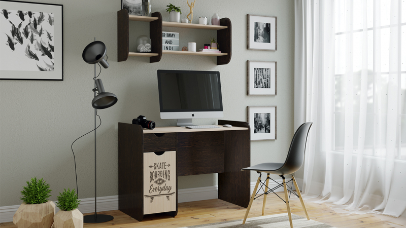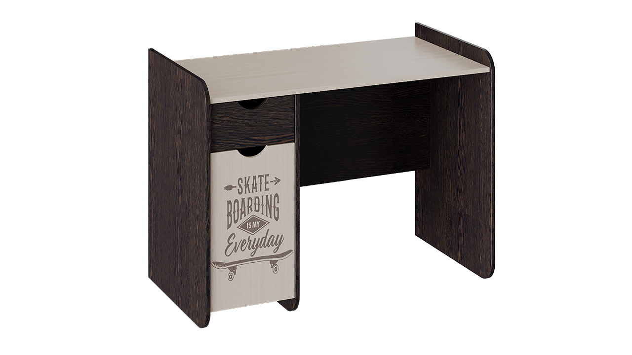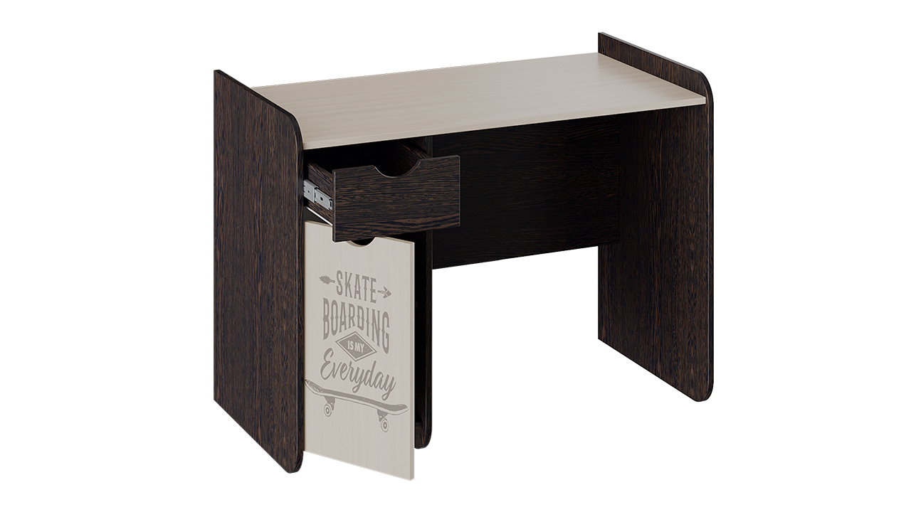 Компьютерный стол Найс — рабочее место для школьника.Стол  имеет скругленные углы, что делает изделие более безопасным.В левой части стола расположен выдвижной ящик на шариковых направляющих и полки за распашной дверкой.Стол изготовлен из ЛДСП, фасад декорирован рисунком.Сборка неуниверсальная.