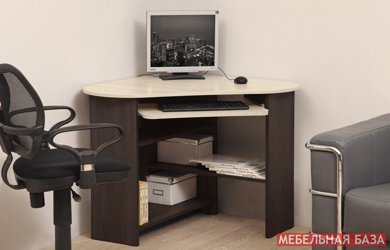 Качественный компьютерный стол ПКС-4 – отличное решение как для школьника, так и для студента. Конструкция изделия позволяет экономить полезное пространство в помещении, так как стол можно поставить в любую пустующую угловую зону. Под столешницей со скруглёнными углами имеется выдвижная панель для клавиатуры, а в корпусе предусмотрены полки для размещения книг, дисков и прочих принадлежностей. Столешница и панель окрашены в светлый цвет и красиво гармонируют с тёмными деталями.