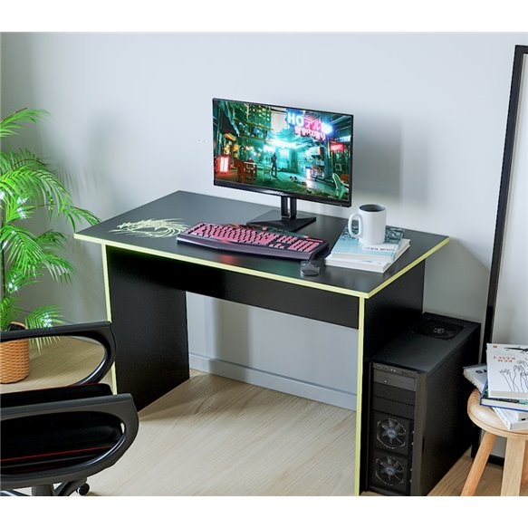 Стол для Геймера выполнен в сочетании цветов специально для ярких людей: черная столешница для стола и его основание прекрасно гармонируют с желтой кромкой, особый шарм ему придаёт рисунок на столешнице, выполненный в стиле шелкография. Этот компьютерный стол идеально впишется в любую комнату дома: поставьте стол в детскую, чтоб получился замечательный рабочий стол для школьника, в кабинет, чтоб использовать его как письменный стол, а благодаря своим размерам он часто используется как стол для геймера.