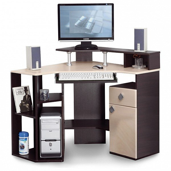 Функциональный и весьма удобный стол для компьютера «Костер-7» создан для людей, ценящих комфорт во всех его проявлениях. Изделие имеет всё необходимое для размещения полноценного стационарного компьютера, поэтому значительно выигрывает у многих других моделей. Благодаря угловой конструкции можно рационально использовать пространство, а наличие большого количества полок и ниш обеспечивает компактное расположение всех принадлежностей, которые могут понадобиться школьнику, студенту. Для сохранения напольного покрытия стол устанавливается на пластиковые подпятники.