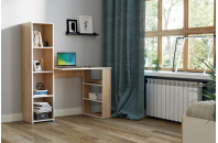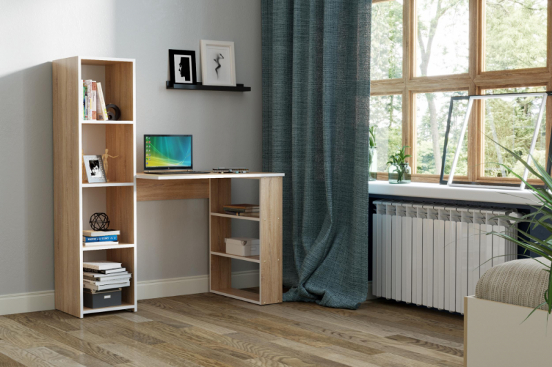 Компактный и функциональный уголок для обстановки зоны рабочего пространства, который не занимает много места особенно хороша для небольших комнат, тем самым вы расширяете пространство для зоны отдыха.Удобный функционал сочетает в себе сразу несколько позиций: компьютерный стол и стеллаж с открытыми полками, и вам не нужно приобретать отдельные элементы мебели. Стол создаст комфортную атмосферу для занятий и учебы, а стеллаж – вместительную систему хранения.