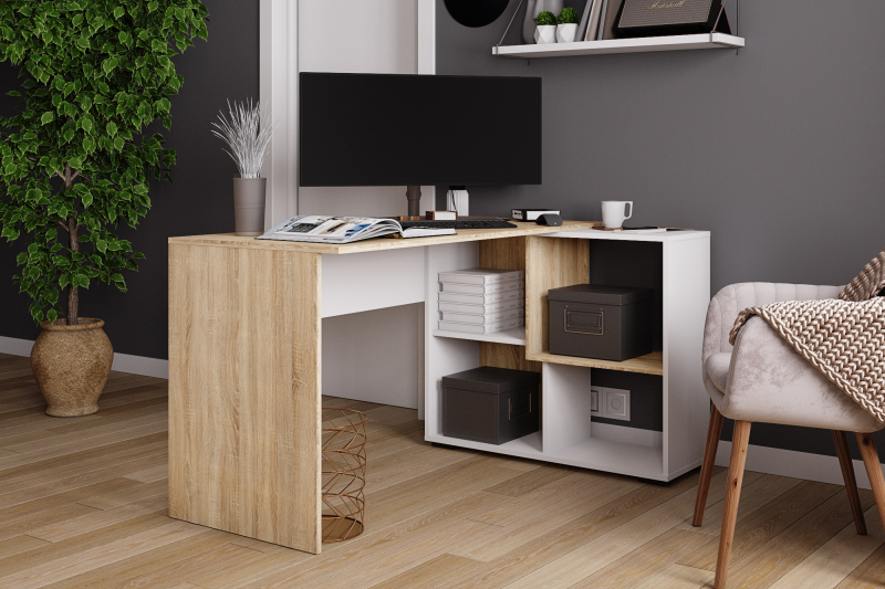 Угловой компьютерный стол СКМУ-4 при своих компактных размерах имеет эргономичную форму и превосходно подойдет для организации места работы или учебы в малогабаритном пространстве. На столе вы легко разместите ноутбук или монитор компьютера, а на открытых полках - нужную оргтехнику, такие как принтер или сканер. Конструкция этого стола для компьютера позволит вам установить его в угол, либо оригинально зонировать пространство комнаты. При создании этой модели использовались только качественные и экологически безопасные материалы, что обеспечит долговечность стола и не навредит здоровью вас и ваших близких.
