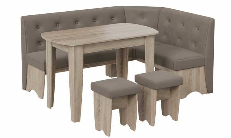 Кухонный уголок "Барселона" отлично впишется в обстановку современной кухни. Мебель имеет неброскую расцветку и функциональный дизайн, благодаря чему легко дополнит интерьер любого стиля. Гарнитур подойдет для оформления обеденной зоны в столовой или места для чаепитий на дачной веранде. Состав набора: угловая скамья, прямоугольный столик со скругленными краями и два табурета.