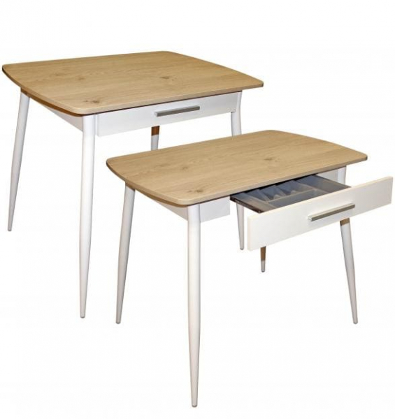 Маленький нераздвижной стол Граус М55 с выдвижным ящиком. Материал столешницы ЛДСП – гигиеничный, легко моющийся и термостойкий, к тому же не боится пятен от кофе, вина, пищевых продуктов. Особое внимание нами уделяется и безопасности за счет использования покрытия торцов стола пластиковой кромкой. Конструкция стола предусматривает крепление ножек к раме при помощи специальных болтов, чтобы при необходимости стол можно было легко разобрать для транспортировки. Данная модель может быть укомплектована по Вашему выбору прямыми или изогнутыми ножками, придающими столу помимо оригинальности дополнительную устойчивость.