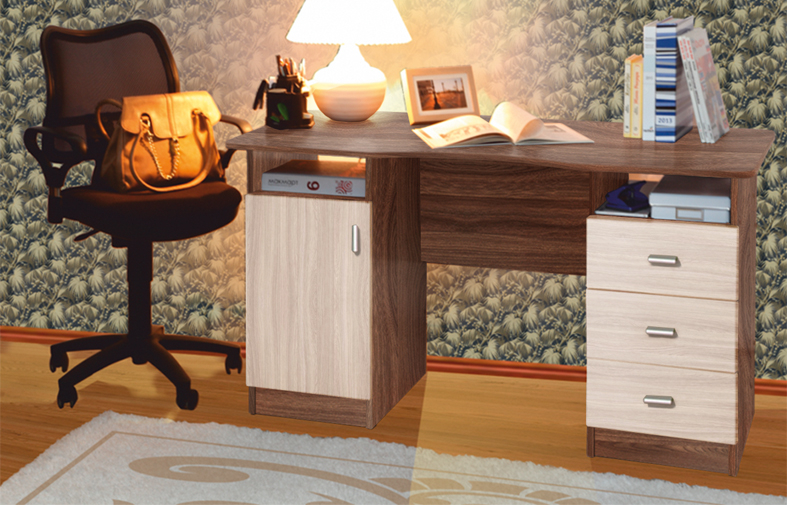 Письменный стол оснащён двумя тумбами, что позволяет удобно выполнять различные виды работ и хранить значительное количество бумаг и предметов. Расстояние между тумбами составляет 560 мм.Рабочая поверхность имеет большую площадь, эстетике изделия способствуют скруглённые углы. Слева расположена секция, скрытая за глухой дверцей. Справа размещены три выдвижных ящика. По бокам выполнены полые ниши, обеспечивающие удобство расположения часто используемых предметов.