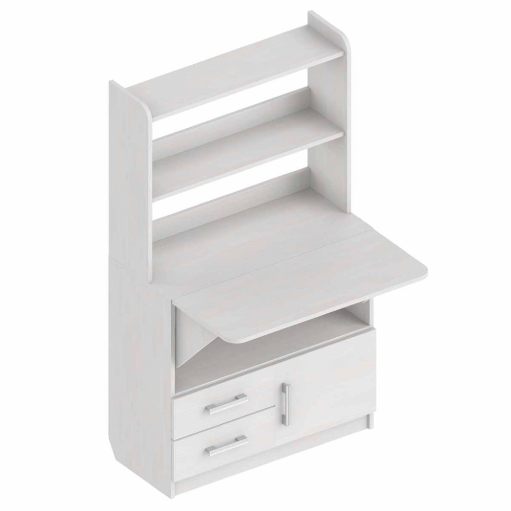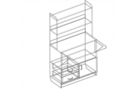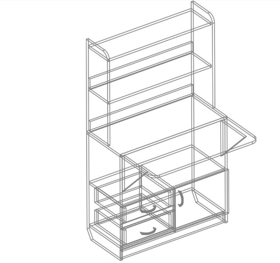 Стол письменный с надстроенными двумя открытыми полочками, на которые можно положить канцтовары или книги. Под столом располагается тумба встроенная, разделенная на два выдвижных ящика и один маленький шкафчик с глухой дверцей.