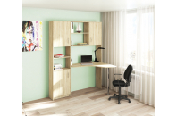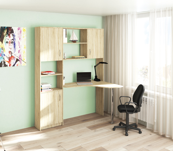 Стол имеет универсальный стеллаж, оборудованный полками для хранения книг, папок и бумаг. Его можно устанавливать как справа, так и слева.