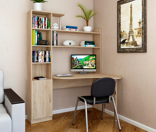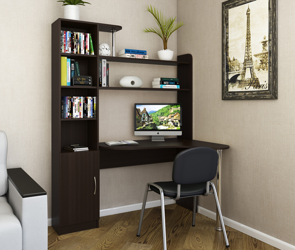 Благодаря высокой боковой стенке с большим количеством просторных полок, здесь хватит места для книг, папок, бумаг, канцелярских принадлежностей, а также офисной техники. При этом надстройка не занимает лишнее пространство комнаты. Боковая панель является универсальной, т.е. ее можно устанавливать либо с правой стороны, либо с левой.