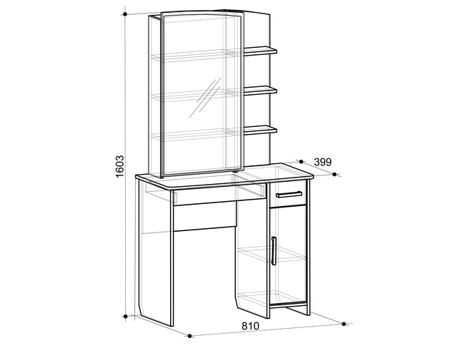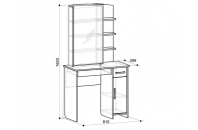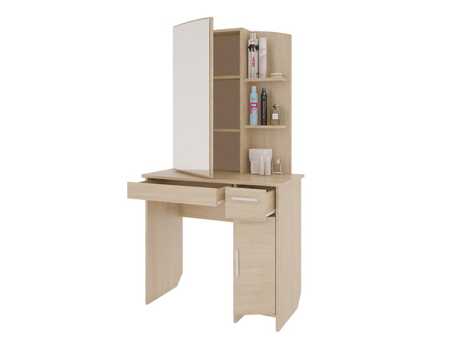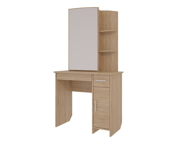 Состоит из: зеркала, полками открытыми и закрытыми, а также ящиками выкатными для мелочей. Трюмо «Виктория 1» выполнено в цвете дуб Сонома. Полки для парфюмерии и косметики, ящики для украшений, фена и мелочей.Основные достоинства модели