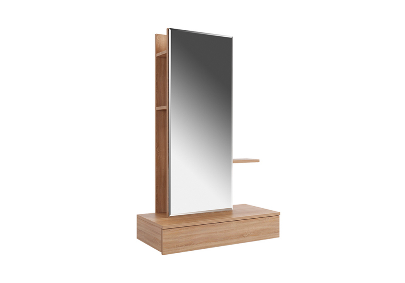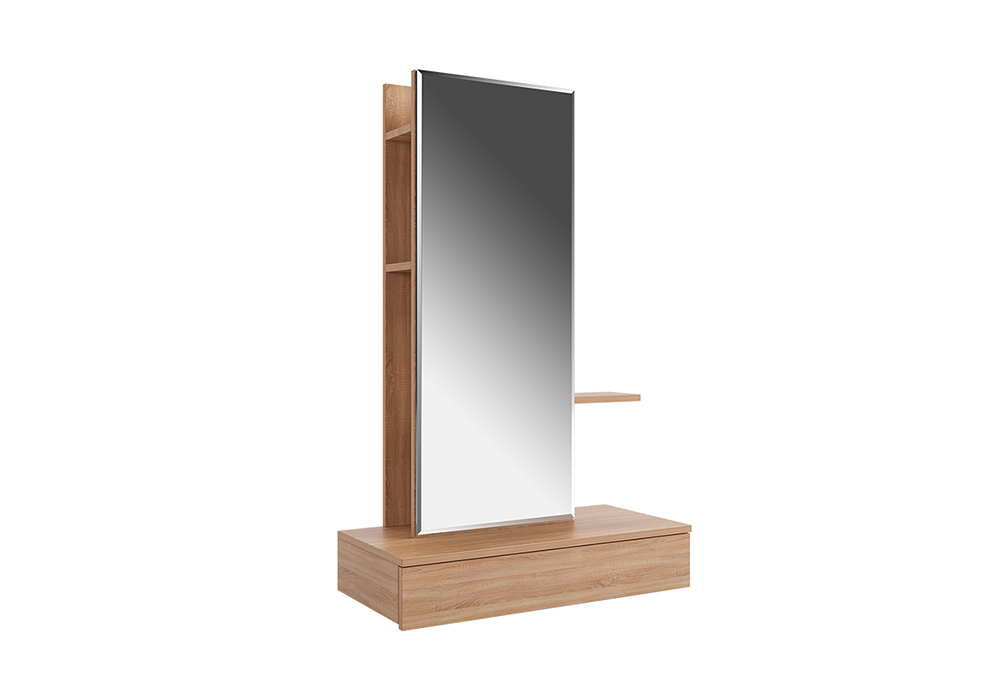 Сборка у трюмо универсальная. Зеркальную панель с полками можно установить ближе к левому либо ближе к правому краю. Так же полки за панелью крепятся в разных положениях.