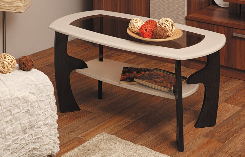 Прямоугольный журнальный столик "Маджеста-3", имеющий столешницу, полку и четыре фигурные ножки. Все детали выполнены максимально качественно и рассчитаны на долгий эксплуатационный срок. Столешница модели оснащена прочной вставкой, изготовленной из тонированного стекла. Она визуально «облегчает» внешний вид изделия и в то же время делает его более солидным. Поверхность деталей, изготовленных из МДФ и ДСП, имитирует массив натуральной древесины и прекрасно сочетается со стеклом.