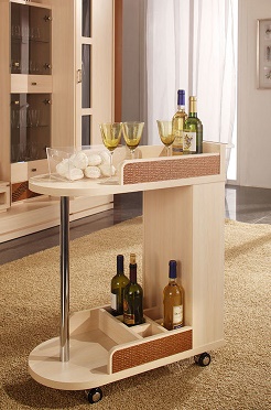Столик барный - демократичное по цене средство создания ощущения обстановки ресторана. Это скорее практичный, нежели стильный предмет. В этом столике все предусмотрено для того, чтобы пользоваться им было удобно и безопасно. Ограничители на столешнице не дадут предметам сервировки съехать с нее при движении. Тоже относится и к вместительной нижней полочке, дополненной специальными держателями для бутылок. Столик оснащен удобной ручкой для передвижения и колесами, которые имеют плавный, бесшумный, легкий ход. С этим столиком вы сможете за считанные минуты преобразить гостиную в столовую, просто подкатив его к дивану со всем необходимым для легкого перекуса у телевизора.