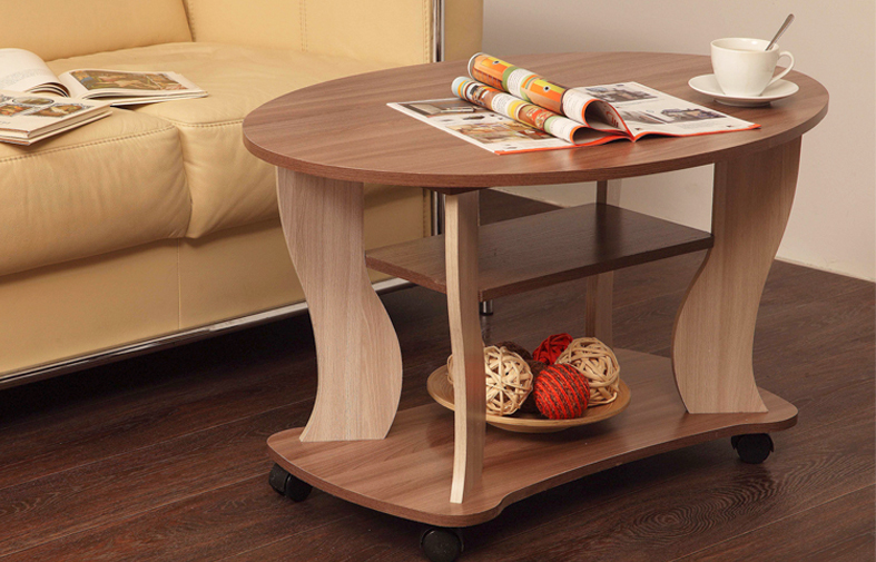 Красивый журнальный столик "Сатурн-М05", отличающийся оригинальным дизайном и функциональностью. Благодаря компактному размеру он не занимает много места и хорошо вписывается в интерьеры разного типа. Его овальная столешница, небольшая прямоугольная полка и фигурное основание соединяются изогнутыми плоскими ножками, которые на несколько тонов светлее других деталей. Для удобного передвижения столика с одного места на другое его основание оснащается прочными колёсными опорами.
