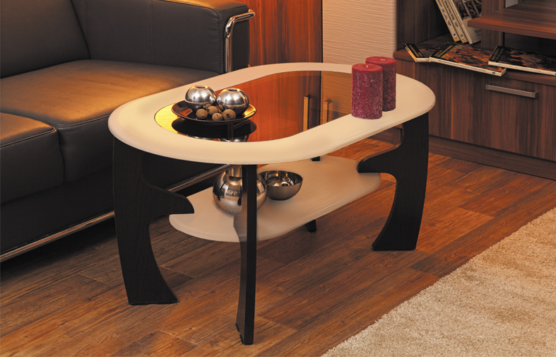 Современный журнальный столик "Маджеста-2", привлекающий внимание неординарным дизайном, оригинальным сочетанием оттенков и красивой вставкой из тонированного стекла. Его тёмные фигурные ножки красиво сочетаются со светлой полочкой и столешницей, образуя единую композицию. Столик не отличается большими габаритами, но при этом на его столешнице и полке можно разместить немало книг, газет, журналов и других предметов.