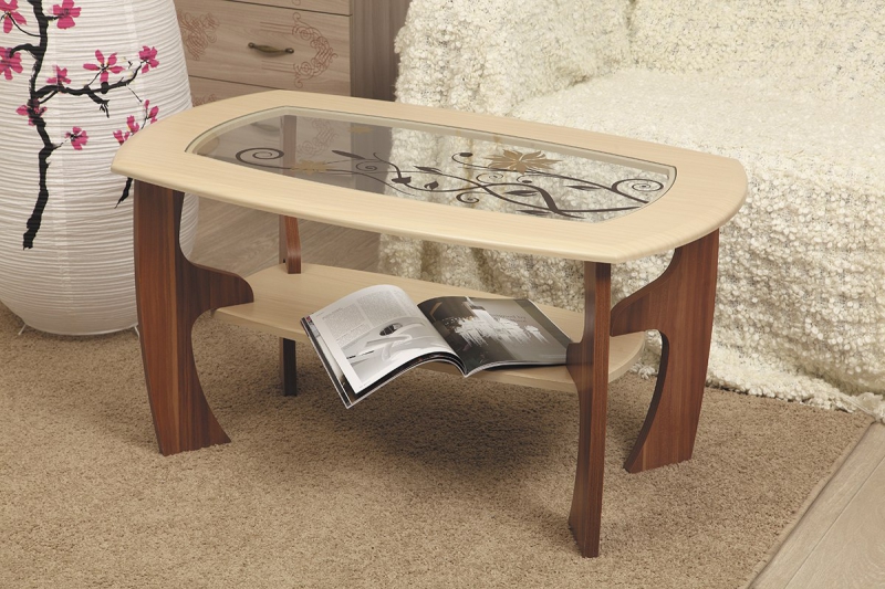 Удобный, красивый столик "Маджеста-3", изготовленный с применением МДФ, ЛДСП, ПВХ и стекла. Его отличительные характеристики заключаются в наличии плавных линий, красивом сочетании цветовых решений и в грамотно продуманной конструкции. Оригинальная форма столешницы смотрится ещё более привлекательно благодаря изящной стеклянной вставке, которая украшается растительным пескоструйным рисунком. Фигурные плоские ножки надёжно удерживают полочку, расположенную под столешницей. Все детали модели отличаются прочностью и долговечностью.