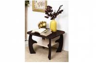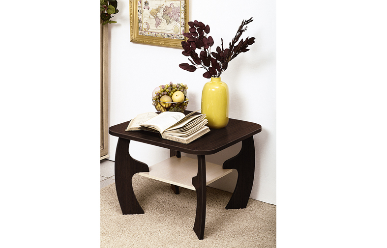 Очень компактный журнальный столик "Маджеста-5", способный дополнить интерьер практически любой гостиной. Его квадратная столешница со скруглёнными углами хорошо гармонирует с небольшой полочкой и плоскими фигурными ножками. Все детали изготавливаются из ДСП, их поверхность имитирует массив натурального дерева. Благодаря оригинальному сочетанию расцветок и красивой фактуре поверхности, столик смотрится современно и привлекательно.