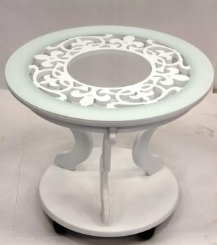Журнальный стол Варьете 9 Ажур белый. Круглая столешница из стекла толщиной 6мм и мдф. Каркас стола из крашеного мдф. Стол стоит на колесных опорах.