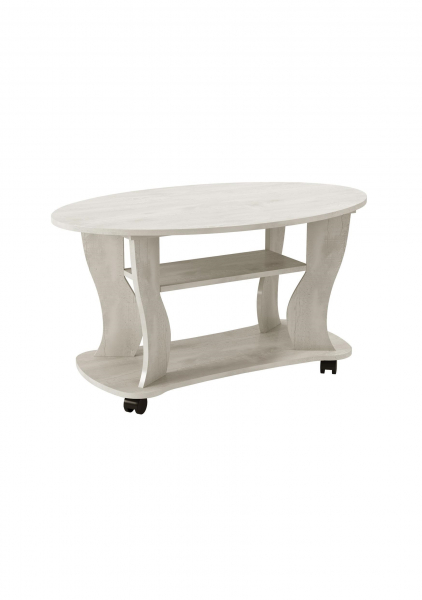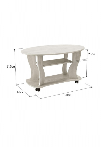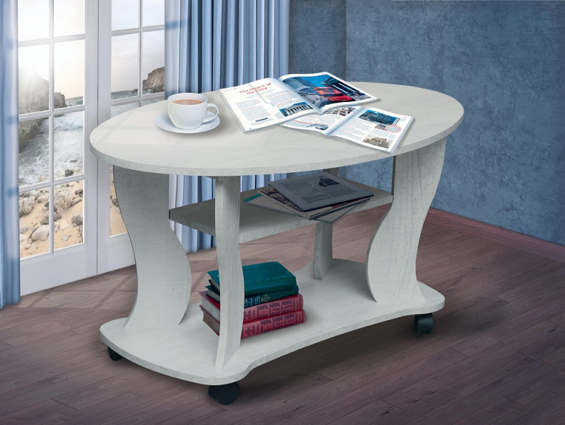 Красивый журнальный столик "Сатурн-М05", отличающийся оригинальным дизайном и функциональностью. Благодаря компактному размеру он не занимает много места и хорошо вписывается в интерьеры разного типа. Его овальная столешница, небольшая прямоугольная полка и фигурное основание соединяются изогнутыми плоскими ножками. Для удобного передвижения столика с одного места на другое его основание оснащается прочными колёсными опорами.